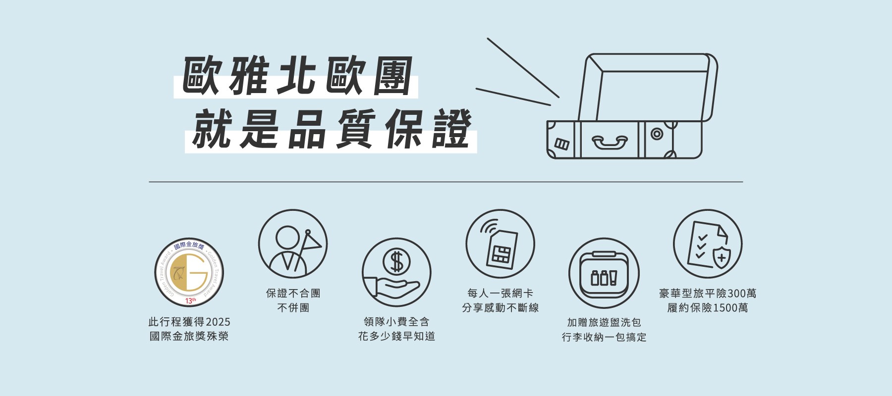 ※ 2026 年全數出發日期皆已在出發前半年以上需求並訂出百年經典飯店及峽灣景觀房,因應各家飯店操作習慣、方式之差異,飯店與房型會因距離出發時間的晚近而陸續確認;但極少數日期適逢重大節慶、當地臨時活動、會展及其他特殊狀況,可能會造成百年經典飯店或峽灣景觀房未下。若未入住百年經典飯店,補償每人 2,500 元台幣/每位(等同一間房 5,000 元台幣),若未入住峽灣景觀房,則補償每人 1,500 元台幣/每位(等同一景觀房 3,000 元台幣)。