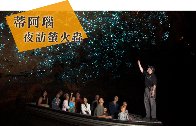 小船駛入幽暗靜謐的洞穴深處,成千上百藍光螢火蟲群聚於此,如繁星閃爍。