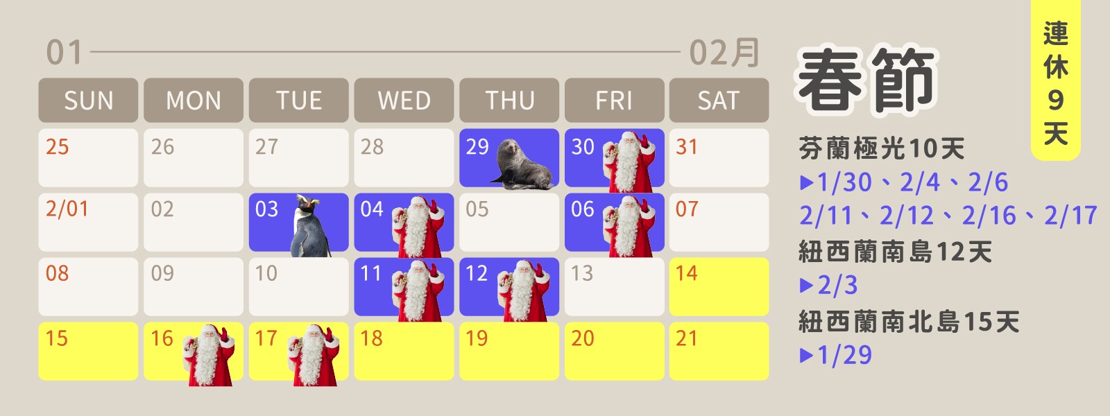 - 春節連假:2/14 (六) ~ 2/22 (日);共9天