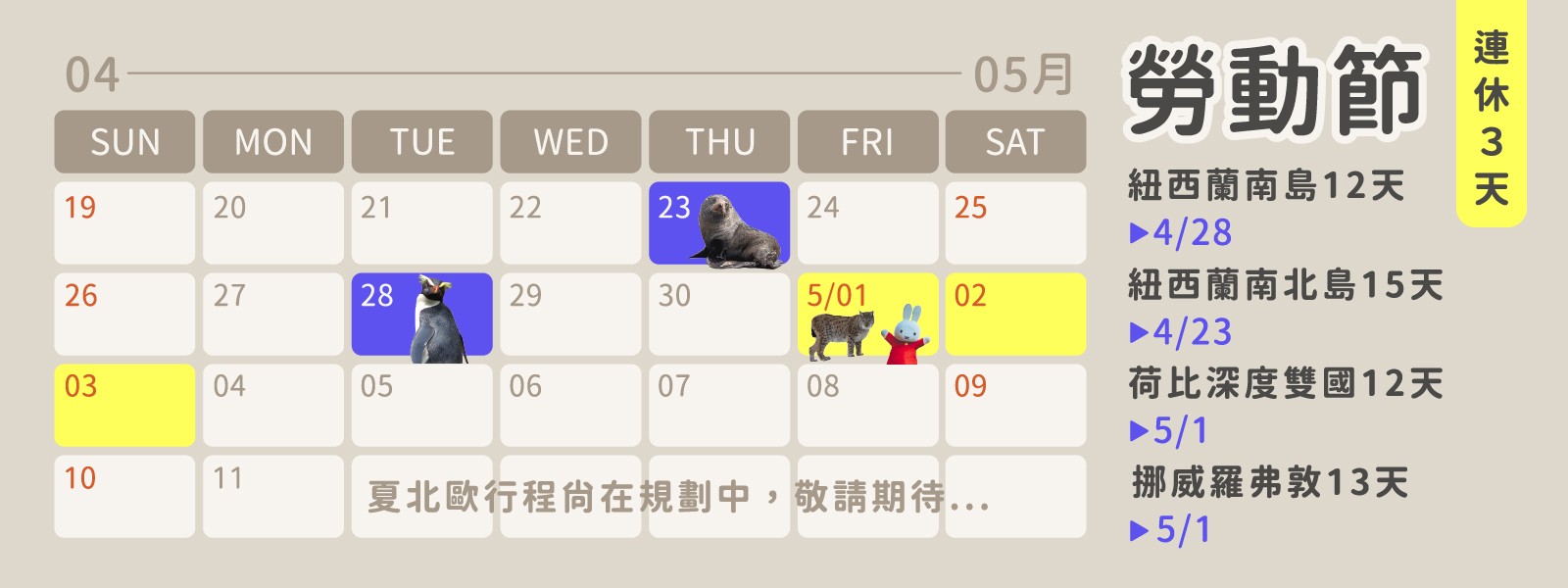 - 勞動節假期:5/1 (五) ~ 5/3 (日);共3天