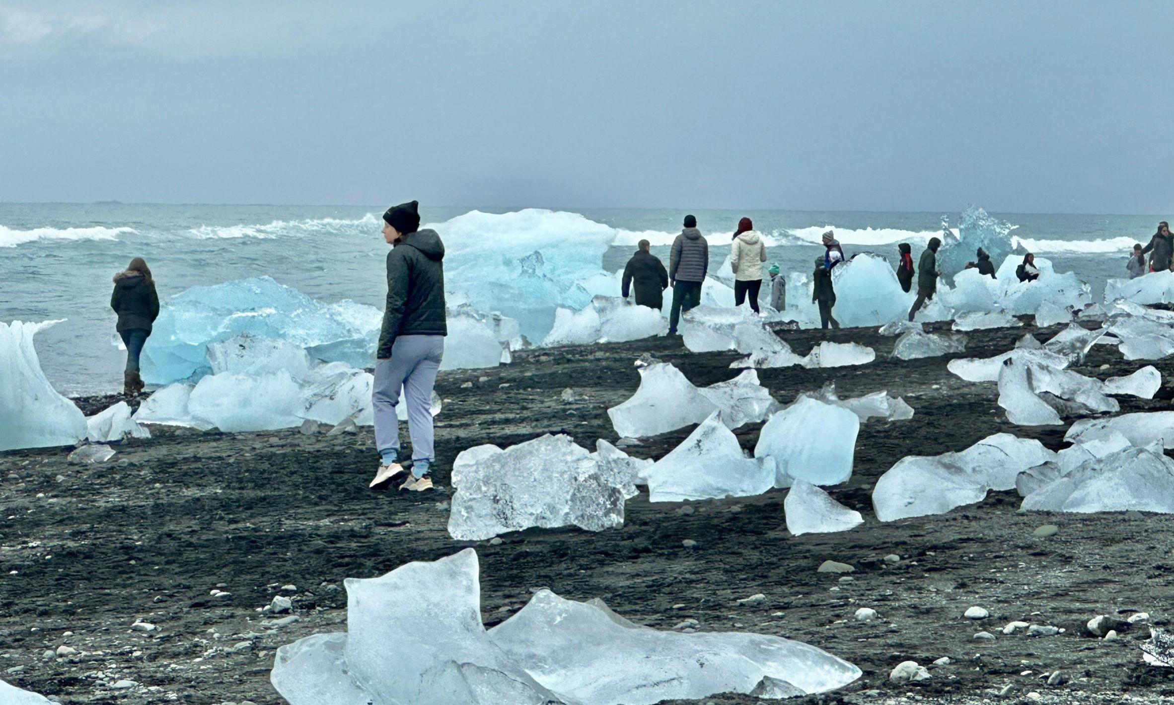 冰川崩落的大小浮冰,散落在黑沙灘上,陽光照射下閃閃發光,宛如一顆顆璀璨寶鑽,令人目不暇給。
