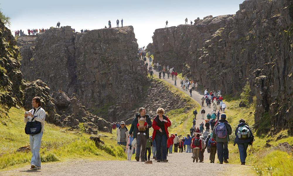 首先抵達☆辛格維利爾斷崖國家公園(2004*UNESCO),此處正是歐亞大陸與美洲板塊交會處,斷層露出地表,形成斷崖,此處是冰島最早移民召開會議,也是最早國會遺址,斷崖近處火山口湖景色優美,令人印象深刻;續前往◎蓋錫爾間歇噴泉,也是英文單字間歇泉「Geysir」的由來,噴發達數十米高的活噴泉;最後一站抵達◎黃金瀑布,瀑布分三段落下,面幅廣大、水量驚人,時而在陽光照射下形成亮豔的彩虹,故有黃金瀑布美名。
