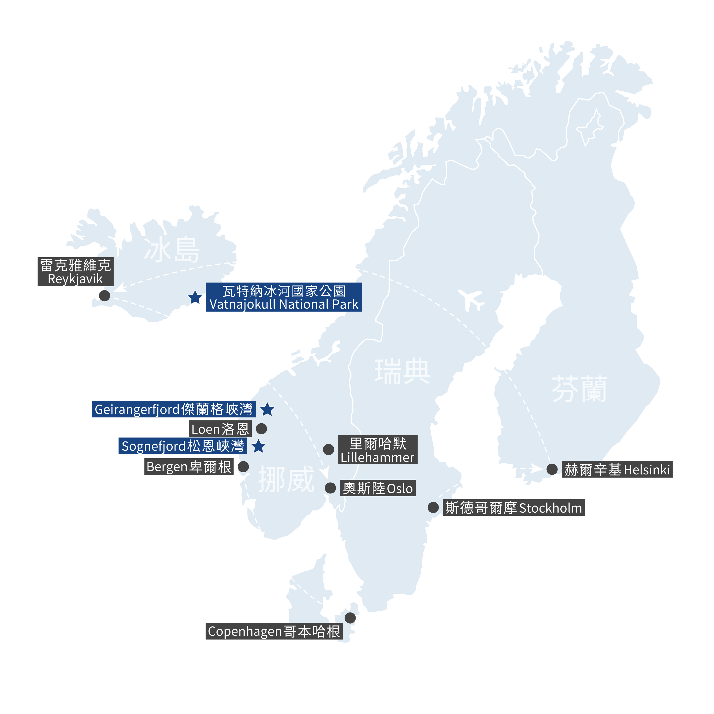 獨家規劃冰與火探險三部曲「火山熔岩隧道+冰河輕健行+冰河潟湖兩棲船」,挪威洛恩天空纜車、雙峽灣遊船、波羅的海遊輪巡弋,安排入住峽灣區百年經典飯店,二歐陸段航班最順遊。