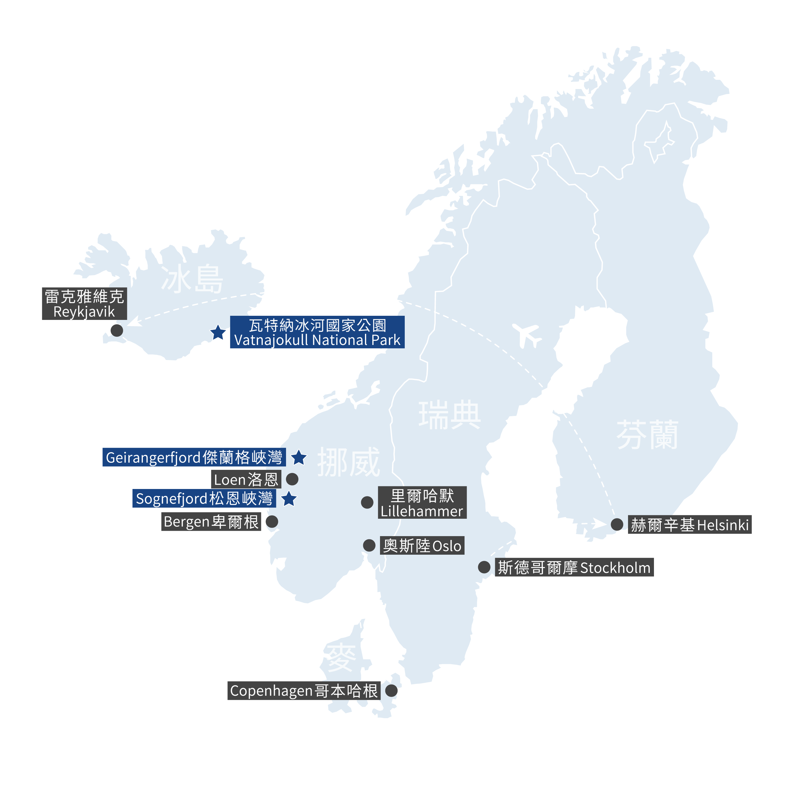 獨家規劃冰與火探險三部曲「火山熔岩隧道+冰河輕健行+冰河潟湖兩棲船」,挪威洛恩天空纜車、雙峽灣遊船、雙波羅的海遊輪巡弋,安排入住峽灣區百年經典飯店,二歐陸段航班最順遊。
