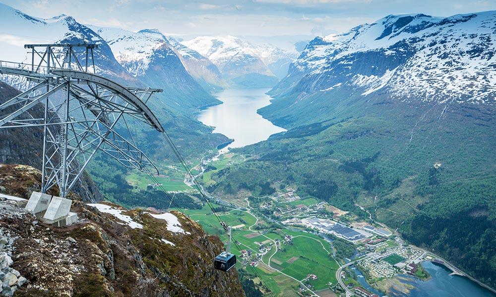 在挪威峽灣區中心的洛恩小鎮,於2017年全新開幕★天空纜車,5分多鐘爬升至1,011公尺峽灣頂,將美景盡收眼底,特別安排於★山頂環景餐廳享用午餐與峽灣特產蘋果汁。