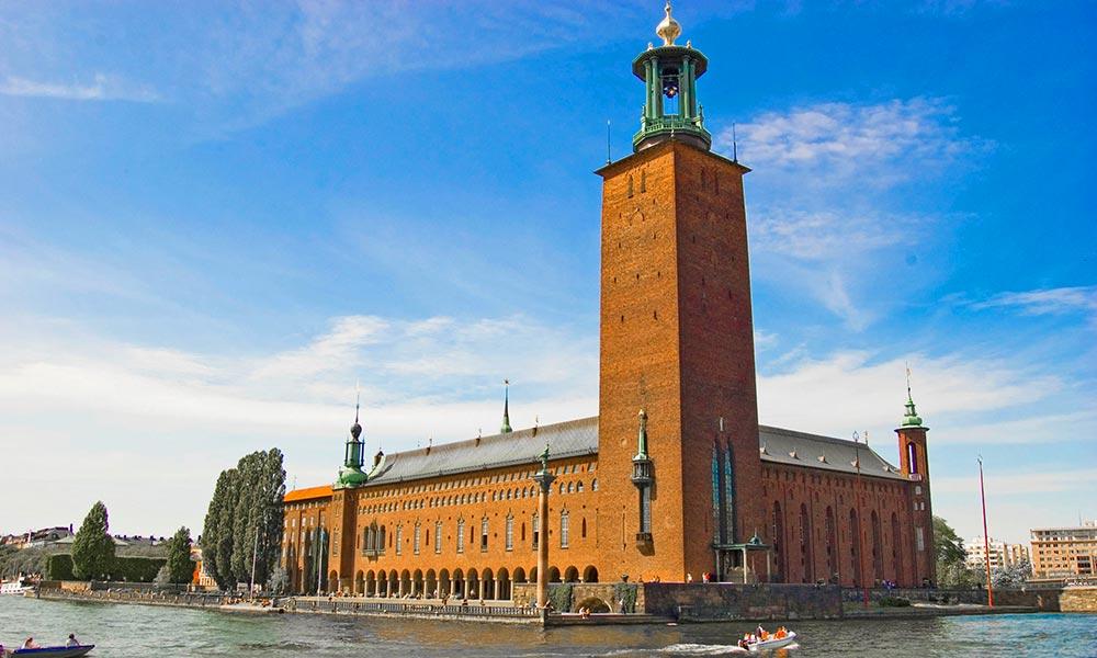 今日抵達碼頭後前往參觀名聞遐邇的●市政廳,外觀壯麗典雅,廳內鋪滿紅磚的「藍廳」是諾貝爾頒獎晚宴的所在。還有其中的「金廳」四面牆壁由超過1800萬塊耀眼奪目的馬賽克金磚拼貼而成,描繪了瑞典的悠久歷史與傳說。