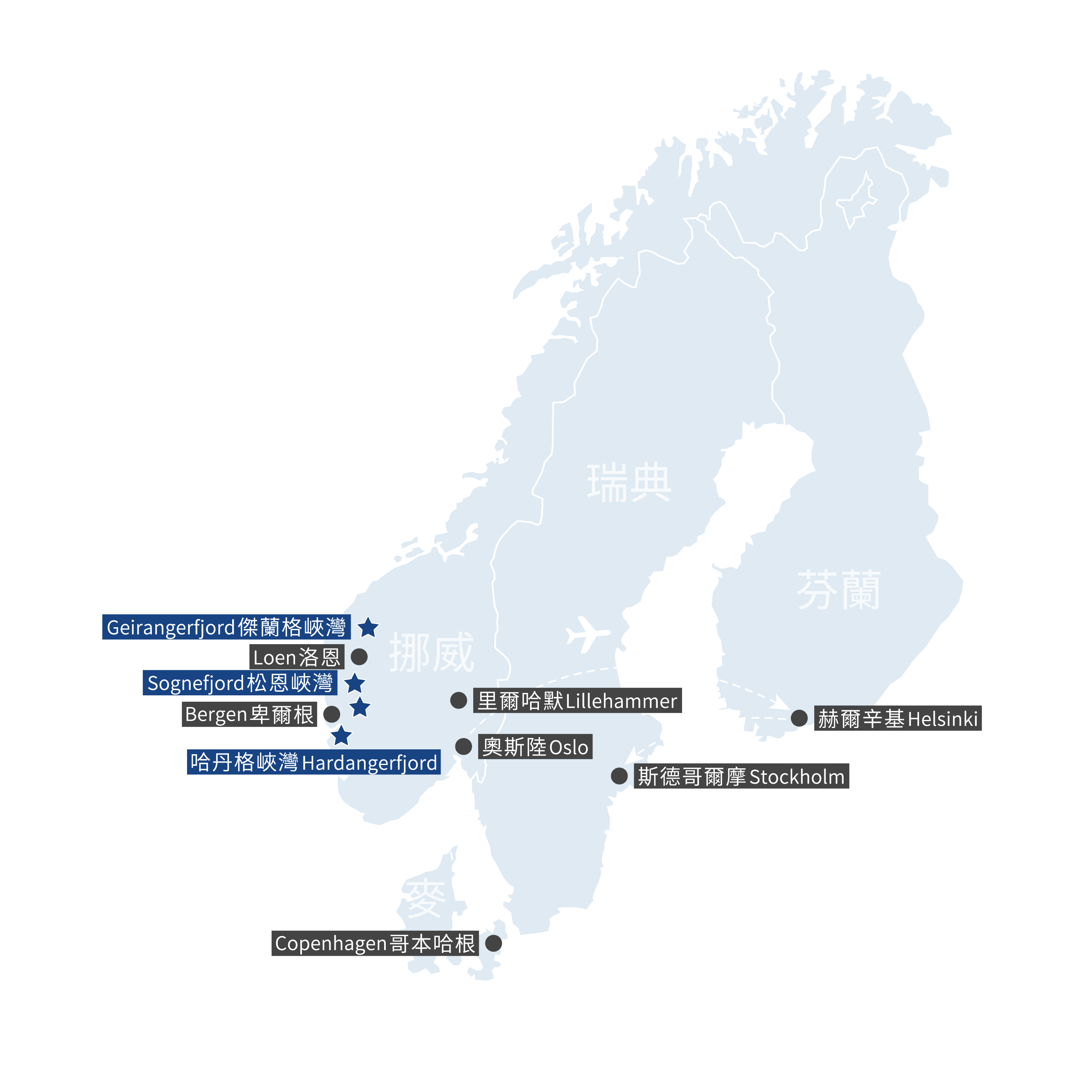 北歐各國政府為減少環境破壞,國家公園、峽灣區內僅開闢一條景觀公路,沿著崎嶇的地勢而建,故離開首都進入峽灣區後,有部分車程較長;飯店與餐廳也因著政府限制,數量少、選擇並不多元,請貴賓入境隨俗,感受100%純淨自然之美。