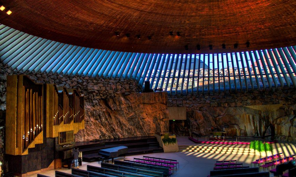 參觀著名的●磐石教堂,教堂外觀就像停在大石裡的飛碟,建築師大膽地將岩石挖空,保留原有粗糙質感,營造出一種特殊的冷調空間(當日若遇教堂活動則無法入內參觀)。