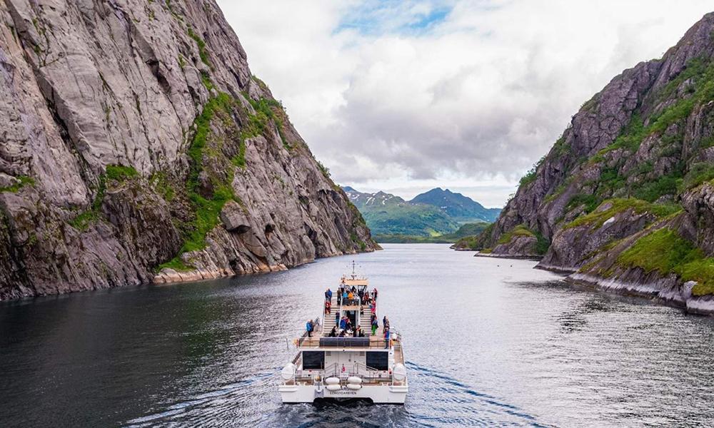 擁有狹窄峽口與兩側高聳山壁的精靈峽灣,景色壯麗如畫。特別安排搭乘混和雙動力遊船,以永續環保的方式,穿梭於壯闊峽灣間,近距離欣賞高峻峽谷與湛藍海水交織的美麗景緻,並有機會目睹野生海鷹振翅同行,體驗北極圈峽灣獨有的寧靜之美。