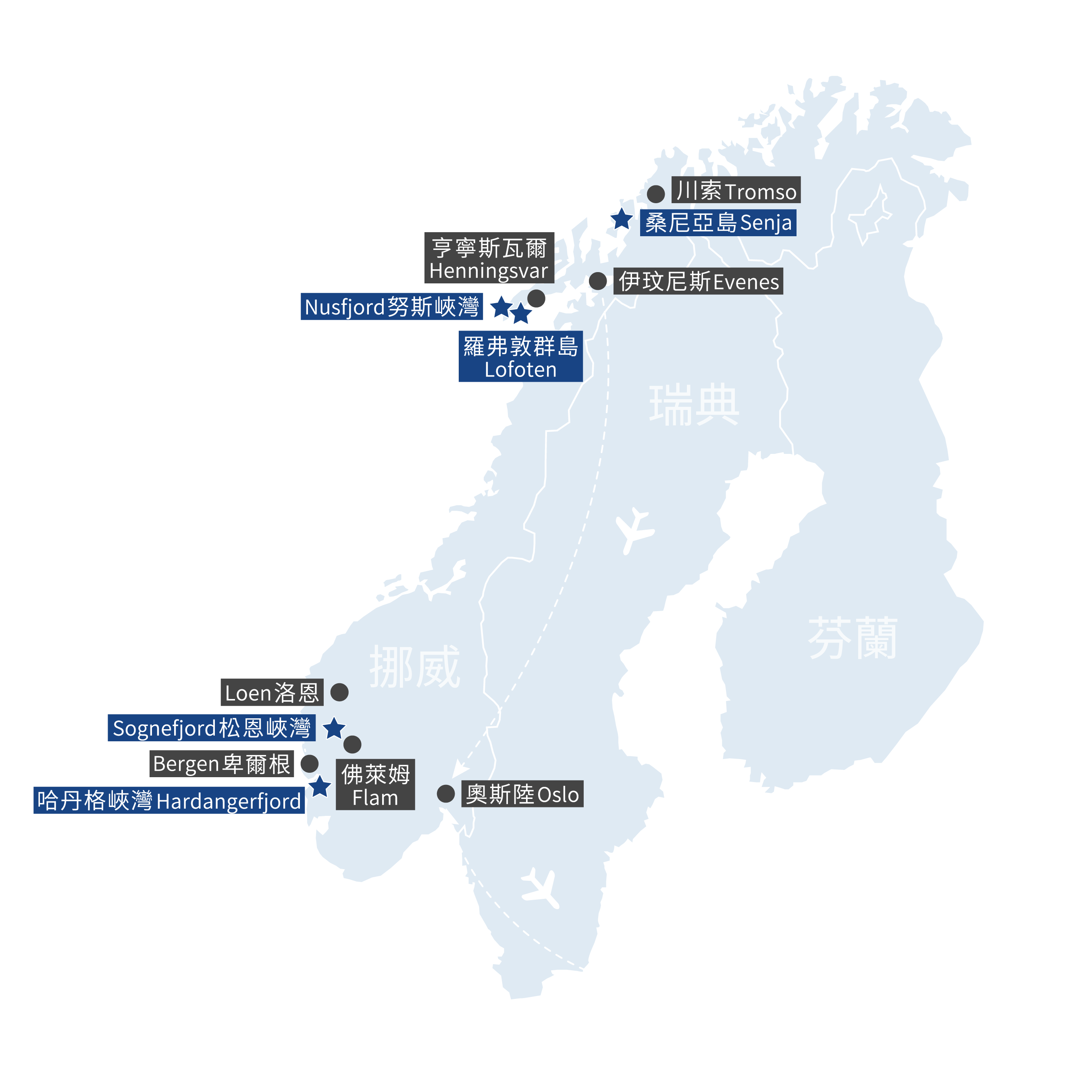 榮獲2025國際金旅獎,雙百年經典飯店、南北雙峽灣遊船巡弋、雙纜車登高、雙景觀公路之旅,探索壯麗峽灣美景;深入北極圈6天5夜(含羅弗敦群島、桑尼亞島),入住網紅級漁屋型旅宿,有機會遇見幸福極光奇景。
