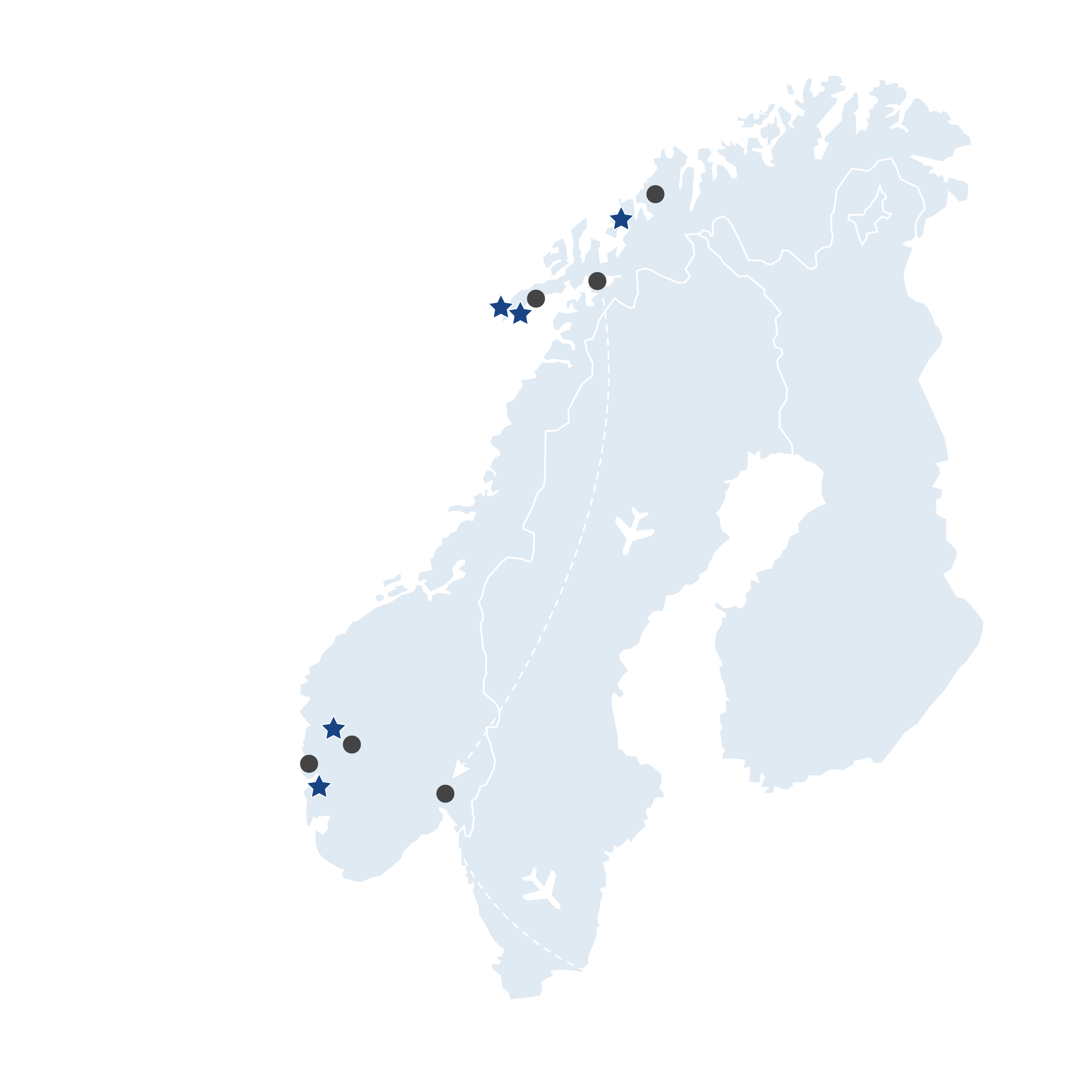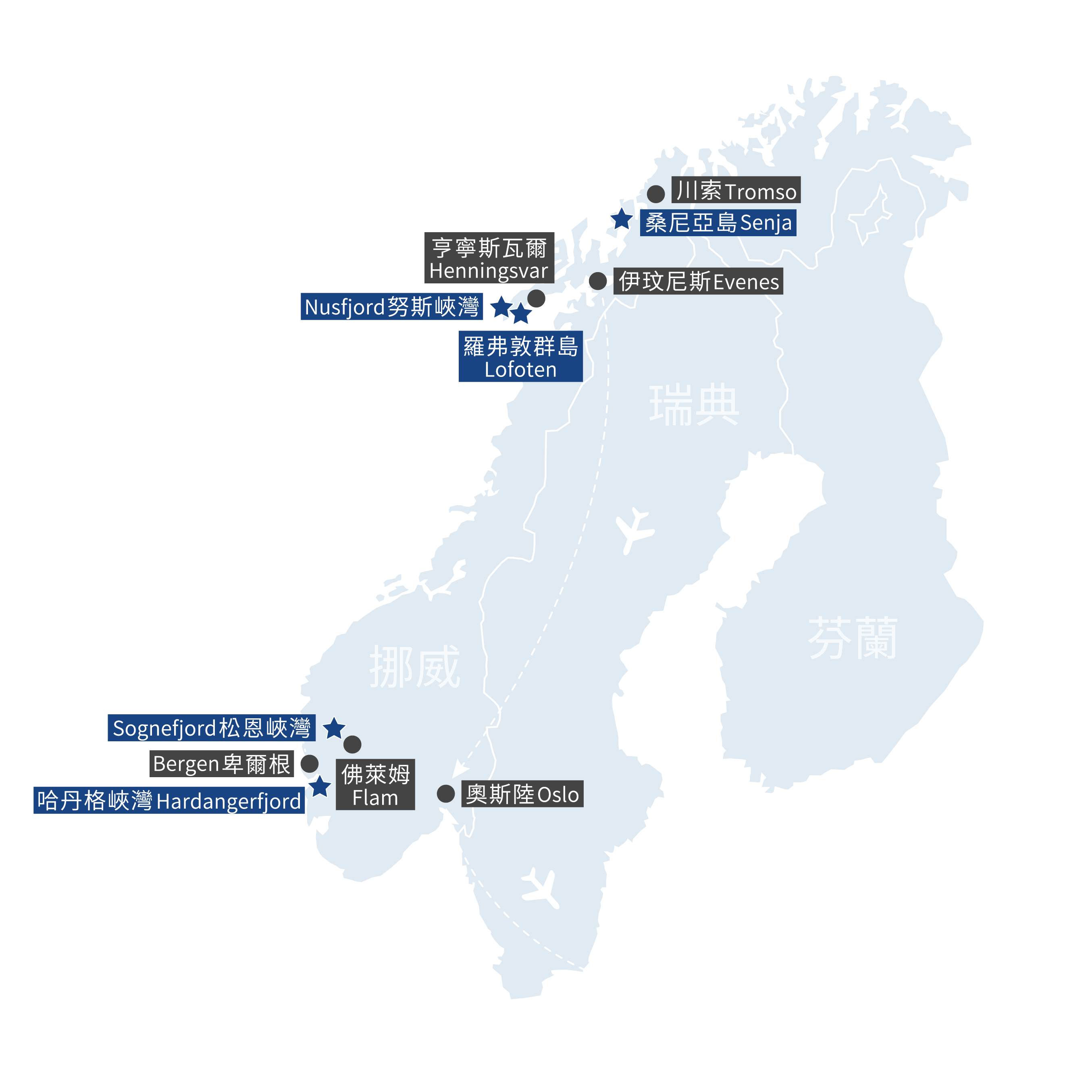羅弗敦網紅漁屋 - (109km/2hr) - 亨寧斯瓦爾 - (188km/3hr) - 伊玟尼斯 - (內陸段航班) - 奧斯陸