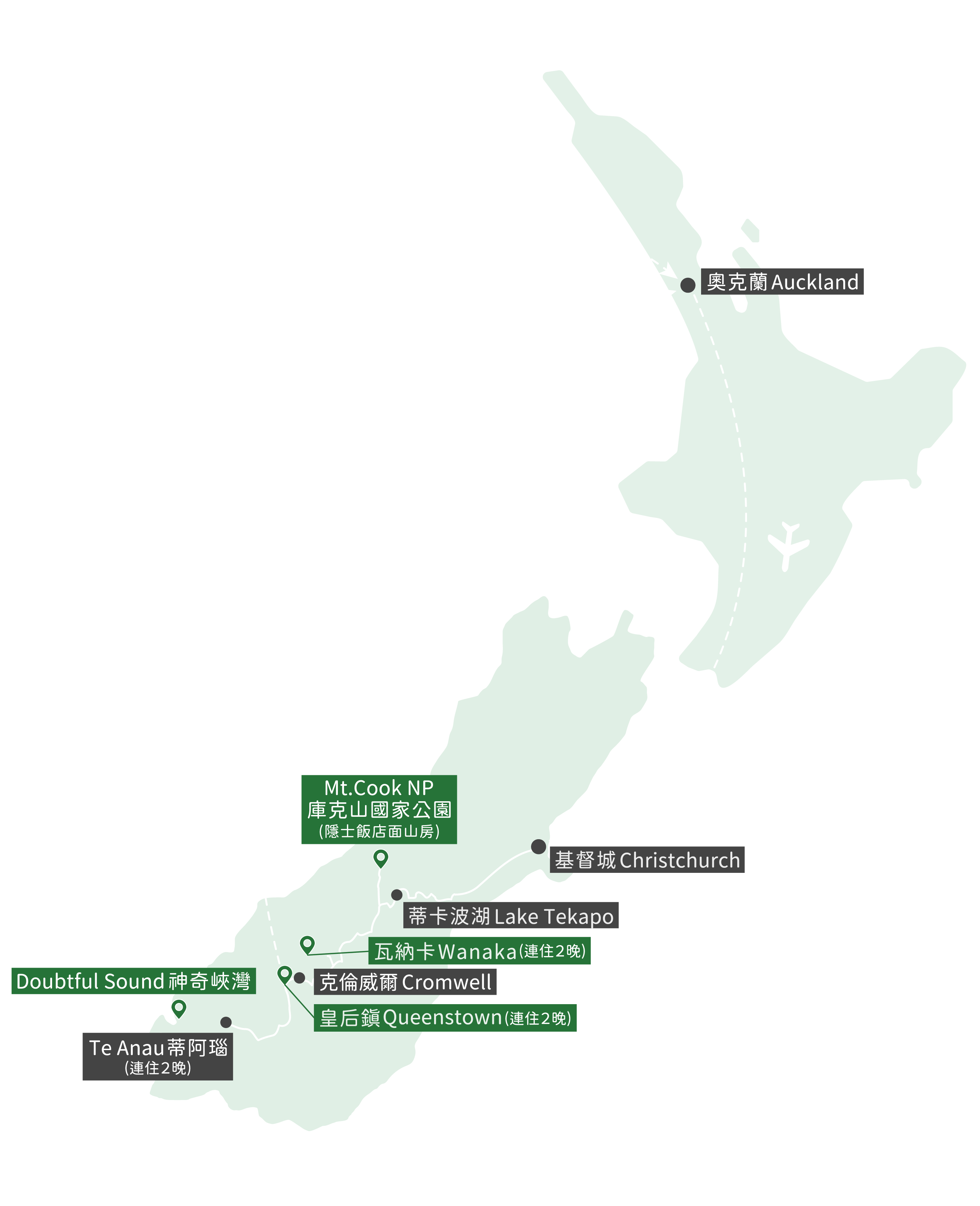 ※ 全數紐西蘭團體出發日期已需求訂出庫克山隱士飯店面山房,且多數已確認訂妥,但極少數日期尚未確認。若未入住面山房,補償每人 3,000 元台幣。