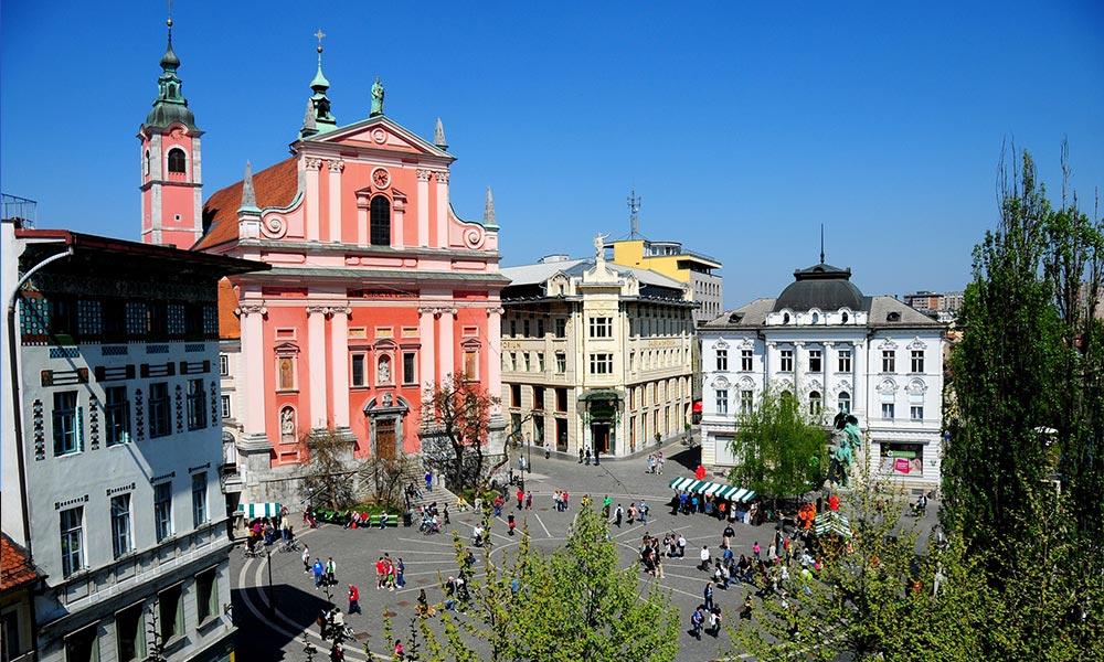 斯洛維尼亞首都,傳說噴火龍是盧城的守護者,隨處可見火龍的蹤影。市區觀光:漫步於◎市政廳廣場、◎三重橋、粉紅色調的◎方濟教堂、◎火龍橋、◎屠夫橋(情人橋)、◎聖尼古拉大教堂、◎中央市集、◎拱廊。接著搭乘●纜車登上興建於1144年的◎盧比安娜城堡,登高遠眺,舊城風光一覽無遺。
